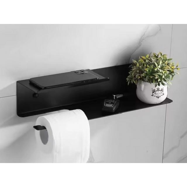 Minimalistický kovový držiak na toaletný papier v industriálnom dizajne, ktorý kombinuje držiak + praktickú poličku.